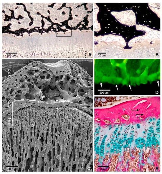 8]. Then, periosteal buds containing blood vessels and perivascular mesenchymal cells invade the middle of the template to generate the primary ossification center, where cartilage begins to be replaced by bone. In addition to this invasion at the central region, secondary ossification centers are subsequently formed at each distal extreme of the template or epiphyses. The primary and secondary ossification centers remain separated by a thin layer of cartilage during the period of active bone growth, the so-called metaphyseal growth plate. The metaphyseal growth plate continuously produces new cartilage, and the replacement of cartilage by bone occurs at the ossification front. Cartilage resorption is balanced by continuous cartilage production, and, as a result, the amount of cartilage remains fairly constant, and a continuous increase in the osseous tissue is produced. After the adolescent growth spurt, all cartilage is replaced by osseous tissue; then, longitudinal bone growth ceases.