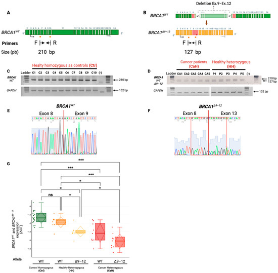 The expression of the BRCA1WT allele is increased in comparison to that of the BRCA1Δ9–12 allele in healthy and cancer-heterozygous patients. (A) A depiction of the 24 exons composing the BRCA1WT transcript (green). Primers for the amplification of the wild-type product recognize the junction of exons 6 and 7 (forward) and exon 10 (reverse), as depicted with yellow squares. RT–PCR produced a 210 bp amplification product of the wild-type transcript. (B) The deletion of exons 9–12 of the BRCA1 gene (green) leads to a mutant BRCA1Δ9–12 transcript (yellow). The primers used for amplification of the mutant transcript recognized the junction of exons 6 and 7 (forward) and the junction of exons 8 and 13 (reverse). RT–PCR produced a 127 bp amplification product of the BRCA1Δ9–12 transcript. (C) Endpoint PCR amplicons from 10 control samples (C1–C10) amplified with a mixture of one forward primer and two different reverse primers. The presence of a single 210 bp band indicates homozygosity for the BRCA1WT allele. GAPDH was used as a housekeeping control gene. (D) Endpoint PCR amplicons of samples from five patients with cancer (CA1–CA5) and five healthy heterozygotes (P1–P5) amplified with a mixture of one forward primer and two different reverse primers. The presence of two bands at 210 bp and 127 bp indicates heterozygosity for BRCA1 and amplification of the BRCA1WT and BRCA1Δ9–12 transcripts. GAPDH was used as a housekeeping control gene; GAPDH controls from CaH and HH samples were run on different gels. (E) Sanger sequencing electropherogram of a BRCA1WT control sample, corroborating the joining of exons 8 and 9 in the amplification product. (F) Sanger sequencing electropherogram of a BRCA1Δ9–12 sample, corroborating the joining of exons 8 and 13 in the amplification product. (G) A comparison of the differential expression between the BRCA1 alleles among the three groups of samples evaluated by RT–PCR and analyzed using ∆CT. There were differences between all the box data of the groups except for the BRCA1WT allele in the HH group, which showed expression levels similar to those of the homozygous control group. All bar comparisons were performed between alleles, not between study groups. The range of differences is indicated by the following values: * < 0.05, *** < 0.001. In the case of no difference, ns—not significant (p > 0.05) was used.