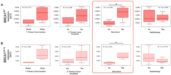 Differential expression of both BRCA1 transcripts is associated with recurrence in patients. The relative expression of the samples (n = 9) was assessed using the ΔCT method, and the differences between groups were evaluated using the Wilcoxon test in conjunction with a Bonferroni adjustment. All analyses were performed using R; statistical significance was set at p < 0.05. Statistically significant differences are marked with * p < 0.05. A red square indicates where an overexpression is observed. (A) Association between clinical characteristics and relative expression of BRCA1WT allele. * p = 0.032 is noted in the red square. (B) Association between clinical characteristics and relative expression of BRCA1Δ9–12 allele variant. * p = 0.016 is noted in the red square.