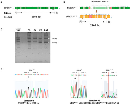 Within the Mexican population, a single BRCA1 founder PV has been documented: the exon 9–12 deletion (BRCA1Δ9–12) [1,11,12]. BRCA1Δ9–12 arises from splicing between the AluSp element in intron 8 and the AluSx element in intron 12, resulting in a significant structural rearrangement and a loss of 15.4 kb of the BRCA1 gene [12]. This deletion induces a premature stop codon in the mRNA, suggesting its likely deleterious nature [12]. Moreover, the exon 9–10 deletion is the most prevalent PV identified in Mexico, associated with a heightened risk of high-grade epithelial ovarian cancer occurring at a younger age. The exon 9–10 deletion also exhibits an extended favorable response to the PARP inhibitor olaparib for recurrent ovarian cancer [1,11,12,13].