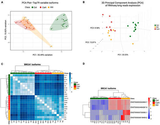 Identification of differential isoform expression. The samples are color-coded as Ctrl (green), HH (yellow), and CaH (red). (A) Principal component analysis (PCA) of WT and 9–12 isoform expression between Ctr, HH, and CaH samples. The plot shows the two principal components. The Ctr samples differentiated from the HH and CaH samples on the PC1 axis with a greater variance (35.49%). (B) Principal component analysis in 3D (PCA 3D), where the samples are visualized in the plot with a third axis, PC3, where HH samples aggregate in the positive values of the axis, separating from CaH samples, which aggregate in the negative values of the axis. The P7 sample can be observed separately from the Ctr group on the PC2 axis. (C) Heatmap of dissimilarity matrix for clustering BRCA1 isoform expression. The color intensity on the map corresponds to the Euclidean distance of samples based on normalized counts of the BRCA1 isoforms, where white indicates high similarity and dark blue indicates low similarity in the isoform’s expression across individuals. (D) Heatmap of isoform z scores of the top differentially expressed isoforms between groups.