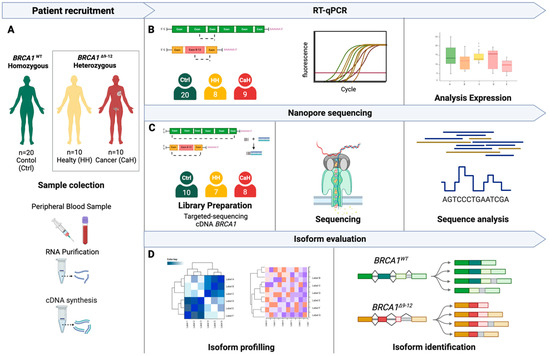 Schematic description of experimental design. (A) Total RNA was extracted from peripheral blood lymphocytes obtained from 20 healthy individuals who were homozygous for the BRCA1WT allele, corresponding to the control group (C); 10 healthy individuals who were heterozygous for the BRCA1Δ9–12 variant (HH); and 10 cancer patients who were heterozygous for the BRCA1Δ9–12 variant (CaH), the last two as study groups. (B) A gene expression analysis between alleles in the three groups was performed with a real-time PCR (RT–qPCR) and ΔCT analysis. (C) A transcription variant analysis of the alleles of the three groups was performed using the Oxford Nanopore target sequencing. Each individual was marked with a barcode, allowing for tracking in each sample. (D) Isoform profiling of the expression pattern in the studied groups.