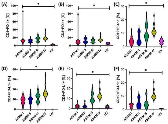 Graphical presentation of changes in the percentages of the tested particles on individual subpopulations of T lymphocytes (A,B,D,E) and B lymphocytes (C,F), taking into account the stages of endometriosis. The lines on the graph represent the first, second, and third quartiles, symbol * means statistically significant results.