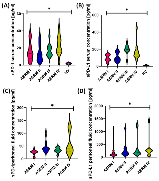 The commercially available Human PD-1 ELISA Kit (range: 25–1600 pg/mL; sensitivity = 9.6 pg/mL) and Human PD-L1 ELISA were used to determine the concentration of soluble forms of PD-1/PD-L1 in serum and peritoneal fluid. Kit (range: 7.81–500 pg/mL; sensitivity = 3.75 pg/mL) was from abcam (Cambridge, UK). The tests were performed following the manufacturer’s instructions, using the Victor 3.0 reader with Workout 2.0 software.