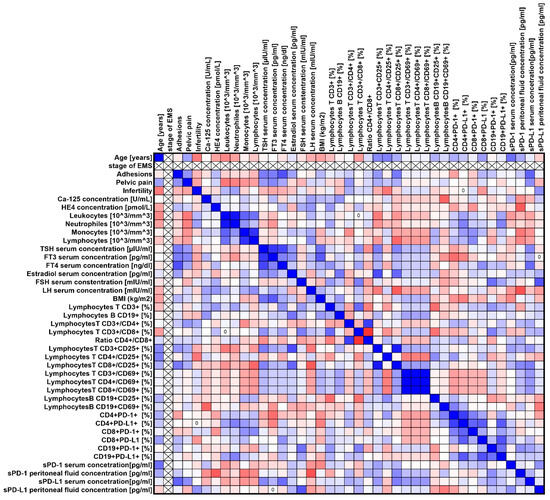 Graphical representation of Spearman’s rank correlation analysis for the entire population of endometriosis patients included in the study. Positive correlations are marked in blue, and negative correlations are marked in red.