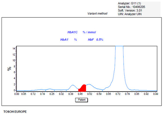 Since the different separation methods available on the market for the evaluation of haemoglobin levels (HPLC vs. electrophoresis) allow for the identification of most of the variants with some differences due to the different chemical–physical principles used, we decided to send our sample to a hospital that employed the capillary electrophoresis method (Capillarys, Sebia, France). The laboratory reported an HbA1c measurement within reference intervals (33 mmol/mol reference, range 20–42 mmol/mol) without indicating the presence of a hypothetical variant (chromatogram not available).