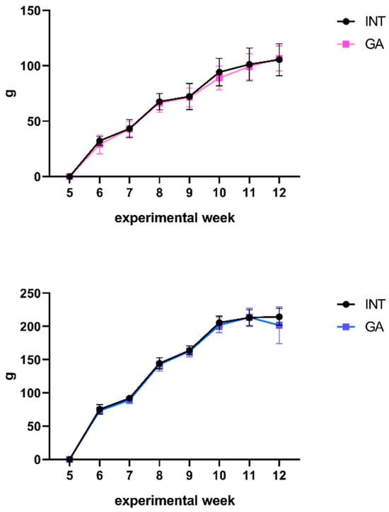2.3.1. Body Mass Gain, Food, and Fluid Intake of Laboratory Animals