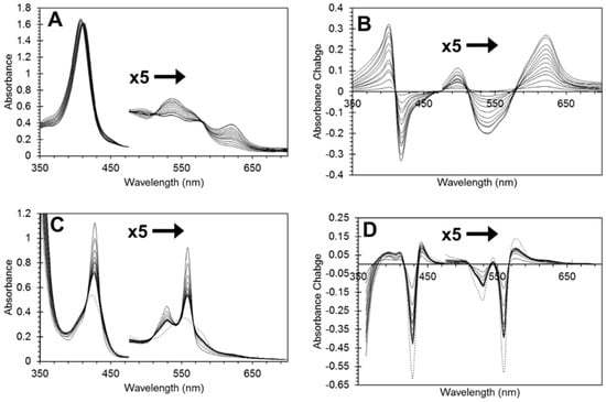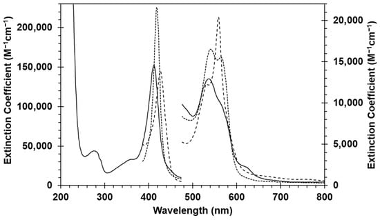 Figure 1 shows the optical spectra of recombinant HGb-I. Extinction coefficients at pH 7.4 were measured by comparison of optical spectra with heme concentration measured by HPLC described in the Section 4. This technique follows the same principle as the historically more commonly used hemochromagen assay [,]. The HPLC and hemochromagen methods both dissociate the heme from the protein through acid-induced breakage of the acid-labile link to the proximal histidine. The heme is then isolated in a volatile organic solvent (here acidified acetonitrile instead of acidified pyridine) for comparison with samples of known concentration. The Soret peak and visible peak wavelengths and coefficients for the ferric, deoxyferrous and ferrous-CO forms of the protein can then be calculated and are given in Table 1.