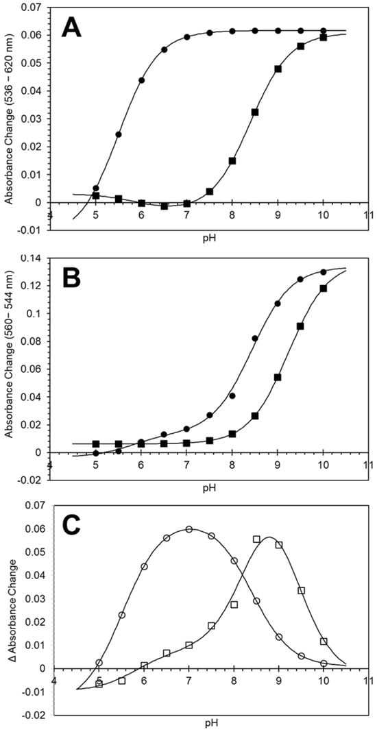 The addition of sodium oleate (five-fold excess) shifted the pKa(obs) of the LS to HS transition (described above) to higher values i.e., oleate stabilizes the pentacoordinate HS form (Figure 2A,B, ■). Oleate (25 uM) shifts the acid–alkaline transition pKa(obs) to 8.40 ± 0.04 and 9.24 ± 0.09 for ferric and ferrous protein, respectively, an alkaline shift of 2.90 and 0.89 pH units, respectively. The ferric protein in the presence of oleate shows an additional minor pKa(obs) at 5.92 ± 0.58, possibly the same protonation event as observed with ferrous protein in the absence of oleate. This minor transition is accompanied by minimal changes in optical spectra and likely arise from protonation of a group in the proximity of the iron, or changes in hydrogen bonding. The oleate has a maximum effect on heme iron ligation at pH values ~7.0 and ~8.5 for ferric and ferrous HGb-I, respectively (Figure 2C).