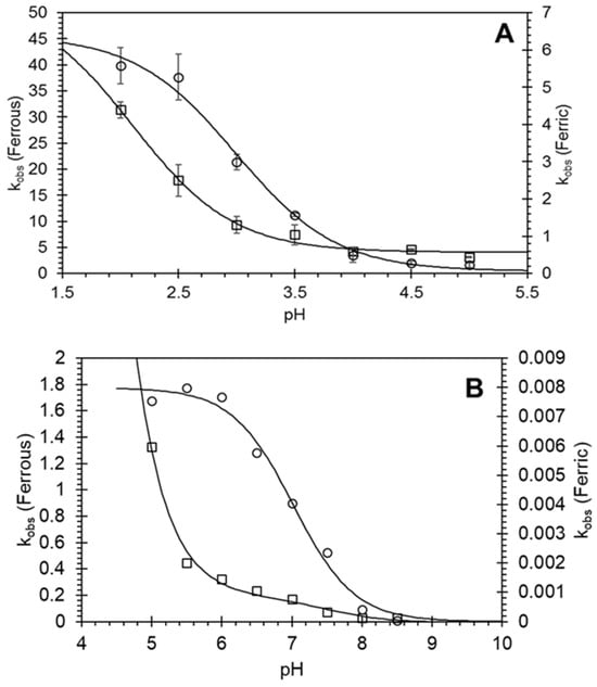 This expression predicts that kobs approaches kb at high pH values and (kf + kb) at low pH values; i.e., it increases with decreasing pH. This transition follows a simple titration curve, with the mid-point yielding the pK of the triggering group, pKa. The alternative model predicts exactly the opposite behavior, namely a decrease in kobs on increasing pH. Given the data in Figure 3A, we can confidently adopt the model in the scheme where it can be seen that a reasonable fit to Equation (1) can be obtained with a pKa ~ 3.0 for ferric protein and ~2.1 for ferrous protein. From the data in Figure 3A and Equation (1), we can calculate the values of kf and kb to be 6.3 and 0.06 for ferric protein and 48.6 and 4.1 for ferrous protein, respectively.