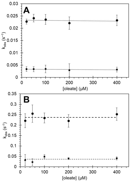 The kinetics of the optical changes resulting from the change in heme iron coordination for HGb-I were measured as a function of oleate concentration for ferric and ferrous protein (Figure 7). The observed rate constants for the LS to HS transition were independent of lipid concentration over the concentration range observed. For ferric HGb-I (Figure 7A), the observed values were 2.32 × 10−2 ± 3.3 × 10−3 s−1 and 7.76 × 10−4 ± 2.1 × 10−4 s−1 for the fast and slow phases, respectively. The slow phase was dominant, comprising ~85% of the optical change at this wavelength; thus for the dominant slow fraction, optical changes were 103–104 fold slower than those observed with Cygb over the concentration range studied. For ferrous HGb-I (Figure 7B), the kinetics were also biphasic, and the fast and slow phases were both lipid concentration-independent. However, the optical changes in the ferrous protein were an order of magnitude faster (2.37 × 10−1 ± 1.7 × 10−2 s−1 and 3.67 × 10−2 ± 9.92 × 10−3 s−1) when compared to the ferric protein. Additionally, the fast phase for the ferrous protein is dominant, responsible for ~80–90% of the amplitude change.
