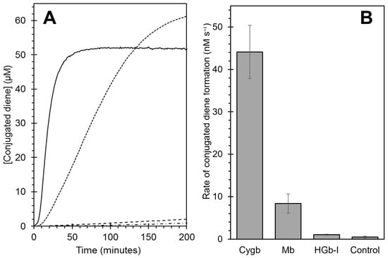 Comparison of the lipid oxidation capability of cytoglobin, HGb-I and myoglobin. (A) Time course of the formation of conjugated dienes resulting from the oxidation of liposomes monitored at 234 nm. Cygb (solid line), Mb (dotted line), HGb-I (dashed line) and control with no proteins present (dot–dashed line). (B) Maximum rates of conjugated diene formation for the three proteins and control (n = 3).