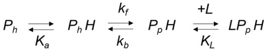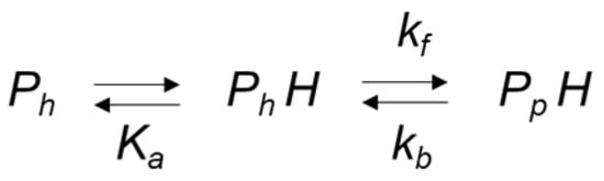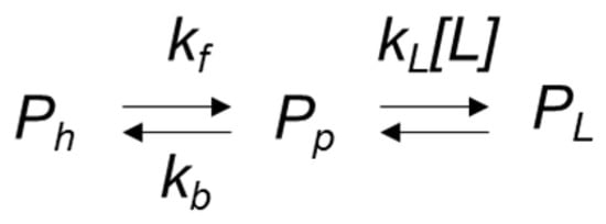 The effect of heme iron coordination on exogenous ligand binding is well known, with a model for the heme coordination of hexacoordinated globins and ligand binding kinetics previously described in detail [,,] and summarized in Scheme 1. In this scheme P is the protein, the suffix h and p denote hexacoordinate and pentacoordinate and L is the ligand. The rate constants for the forward and back reactions for the conformational change between the coordination states are denoted kf and kb and kL[L] the ligand concentration-dependent rate constant for ligand binding.