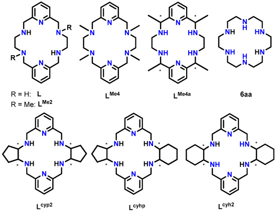 - Dhont, K.I.; Herman, G.G.; Fabretti, A.C.; Lippens, W.; Goeminne, A.M. Protonation and metal-ion complexation in aqueous solution by pyridine containing hexaaza macrocycles. J. Chem. Soc. Dalton Trans. 1996, 1753–1760. [Google Scholar] [CrossRef]