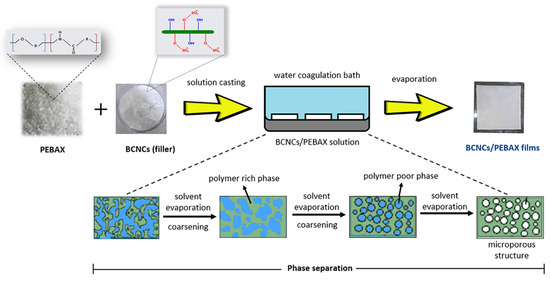 Schematic diagram of the formation of BCNC/PEBAX microporous membrane by flow casting method [77]. Copyright © 2023, with permission from Elsevier.