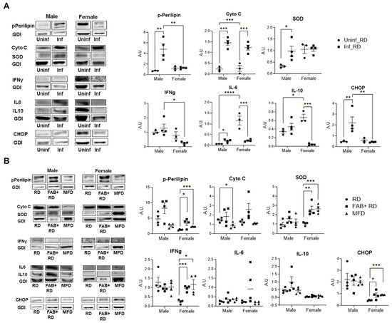 Figure 2. Body fat gain and fat loss induce alterations in lung lipid metabolism and inflammatory signaling between sexes during acute Mtb-infection. Immunoblot analysis of lipid hydrolysis marker (p-Perilipin), mitochondrial OX-PHOS markers (Cytochrome C and SOD), inflammatory markers (IFNγ, IL-6 and IL-10), and apoptosis marker (CHOP) in the lung protein lysates. Bar graph values were derived from densitometry analysis and by normalizing target protein expression to GDI. (A) Bar graphs illustrate the mean protein levels in both uninfected and infected RD-fed groups for males and females. (B) Bar graphs depict the variations in the mean protein levels of respective target protein among the different infected groups (RD-fed, FAB+ RD-fed and MFD-fed) for both males and females. The error bars represent standard error of the mean. Statistical significance was calculated using two-way ANOVA, with sex and infection as variables (A); and t-test, analyzing the changes with respect to RD groups in both male and female Mtb-infected mice (B). * p < 0.05, ** p < 0.01, *** p < 0.001 and **** p < 0.0001 between indicated groups. The complete immunoblot images for all the proteins are provided in the supporting data values file.