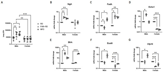 Our data indicated variations in lung bacterial burden between males and females, along with differences in lung metabolic and immune signaling during Mtb infection in both sexes when subjected to fat loss or fat gain. This indicates that the altered metabolic state of the lungs may regulate metabolic genes in Mtb, influencing its dormant or replicative status, which, in turn, could impact the lung bacterial burden. The lung pathology depends on the level of replication and persistence of Mtb and the host immune system. To investigate the possible correlation between lung bacterial burden and the metabolic status in the lungs, we conducted an analysis of certain Mtb-specific genes using qPCR. First, we examined the levels of the Mtb-SigA gene in the lungs of infected mice (Figure 3B). We found that the levels of SigA significantly increased in FAB+ (p = 0.002) and MFD-fed (p = 0.002) groups in male mice but remained unchanged in female mice compared to their respective sex-matched infected RD-fed groups (Figure 3B). These data align with the lung bacterial burden (Figure 3A), suggesting that fat gain and fat loss have a lesser impact on lung Mtb load in females, whereas they promote Mtb load in the lungs of males.
