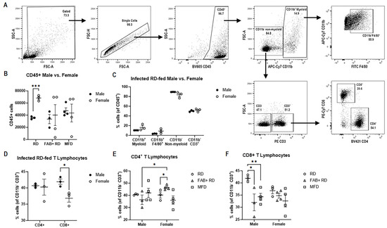 Figure 4. Flow cytometry analysis of Mtb-infected murine lung. (A) Gating strategy for immunophenotyping infiltrated immune cell population; (B) Bar graph showing the frequencies of CD45+ cells between male and female and among different diet and FAB+ groups; (C) Bar graph showing the percentage of CD11b+ myeloid, CD11b+F4/80+ (double positive), CD11b non-myeloid and CD11bCD3+ cells from parent CD45+ population in infected RD-fed male and female mice; (D) Bar graph showing the percentage of CD4+ and CD8+ cells from parent CD11bCD3+ T-lymphocytes between infected RD-fed males and females; and (E,F) Bar graph showing the percentage of CD4+ and CD8+ T-cells among different diet and FAB+ groups in males and females. The error bars represent the standard error of the mean. Statistical significance was calculated using a t-test between male and female (BD); and two-way ANOVA, with sex and alteration in body fat level as variables (E,F). * p < 0.05, ** p < 0.01, and *** p < 0.001 between indicated groups.