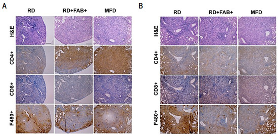 Figure 5. Fat loss and fat gain influence the distribution of immune cells within granulomatous lesions in a sex-specific manner. Representative immunohistochemistry (IHC) images of the Mtb-infected murine lung sections stained with CD4, CD8, and/or F4/80 antibodies in males (A) and females (B). Magnification-4×; Scale bar = 100 µm. Lung sections were from RD-fed, FAB+ RD-fed, and MFD-fed groups.