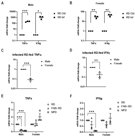 Figure 6. Male CD8+ cells showcase greater pro-inflammatory potential in RD-fed mice during acute Mtb infection compared to females as demonstrated by qPCR analysis. Fold change increase in TNFα and IFNγ mRNA transcripts in naïve CD8+ T-cells in uninfected RD-fed (RD Ctrl) mice compared to Mtb-infected RD-fed (RD Inf) mice in males (A) and in females (B). Fold change in TNFα (C) and IFNγ (D) compared between infected RD-fed males and females. Fold change in TNFα (E) and IFNγ (F) between the different groups (RD, FAB+ RD and MFD) compared to infected RD-fed mice in males and females. The error bars represent the standard error of the mean. Statistical significance was calculated using a t-test. * p < 0.05, ** p < 0.01, and *** p < 0.001 between indicated groups.