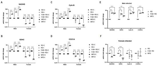 Mounting evidence suggests that mitochondrial dysfunction can polarize innate immune responses and increase host susceptibility to certain pathogens by altering mitochondrial metabolism and homeostasis [27,28]. Given the increased accumulation of lipid droplets in the lungs and the altered lung metabolic status in Mtb-infected mice, it is critical to examine whether the increased lipid droplets in the lungs affect mitochondrial oxidative phosphorylation in lung-infiltrated CD8+ T-cells. Therefore, we examined the mRNA expression levels of NADH (NADH dehydrogenase, Complex 1), SDHC (Succinate dehydrogenase, c subunit of Complex 2), Cyto B (Cytochrome bc1, Complex 3), and COX1A in the mitochondrial respiratory chain of unstimulated CD8+ T-cells isolated from the lungs of Mtb-infected mice by qPCR analysis. We found that the mRNA levels of all the tested mitochondrial genes were significantly upregulated in CD8+ cells in male-infected RD-fed mice, infected fat ablated mice and infected fat induced mice (p = 0.0003) and significantly downregulated in female-infected RD-fed mice, infected fat ablated mice and infected fat induced mice (p = 0.0004) compared to their respective sex-matched uninfected mice (Figure 7A–D). However, the levels of all the tested mitochondrial genes were either significantly upregulated or remained unaltered in infected female RD-fed mice compared to infected male RD-fed mice (Supplementary Figure S6). These data suggest that the basal levels of mitochondrial oxidative phosphorylation in resting CD8+ cells are significantly higher in infected females compared to infected males. These data also suggest that the increased mitochondrial oxidative phosphorylation in female RD-fed mice might have led to decreased expression levels of pro-inflammatory cytokines (TNFα and IFNγ) in females compared to male RD-fed mice during Mtb infection.