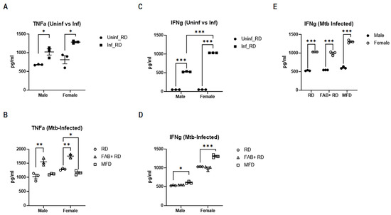 Figure 8. Females exhibit stronger systemic IFNγ response against Mtb infection. Representative bar graphs showing circulatory cytokine levels of TNFα (A,B) and IFNγ (CE) in the plasma of uninfected and Mtb-infected male and female mice as analyzed by ELISA. The error bars represent the standard error of the mean. Statistical significance was calculated using a t-test. * p < 0.05, ** p < 0.01, and *** p < 0.001 between indicated groups.