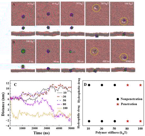 To examine the influence of polymer stiffness on its penetration capability, different stiffness polymers were designed, namely K = 10 kBT, 30 kBT, 50 kBT, 80 kBT, and 100 kBT. In an experimental study, it was demonstrated that hydrophobic copolymers initially adhere to the lipid bilayer, and continued polymer surface penetration increases interfacial viscoelasticity []. Moreover, hydrophilic NPs are flattened in the membrane plane, while hydrophobic NPs are elongated along the membrane norm during penetration []. To balance water solubility and membrane penetration, both hydrophilic and hydrophobic polymers were constructed on the surface of the cargo. In varying systems, only the stiffness of the polymer was altered while keeping other parameters constant.