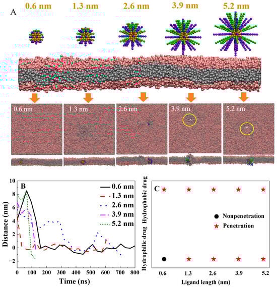 Polymer length is a crucial factor in designing drug/gene delivery carriers. In this work, we further investigated the impact of polymer length on their penetration ability. As shown in Figure 3, short polymers (1 bead, L = 0.6 nm) can only assist the hydrophobic cargo across the lipid membrane (Figure 3A, L = 0.6 nm). When the length of polymers is 2.6 nm (4 beads), it can carry the cargo across the membrane to the lower leaflet of the phospholipid membrane (Figure 3A, L = 2.6 nm). Increasing the polymer length enhances its ability to deliver cargo deeper into the lipid membrane. Moreover, with further increases in polymer length to six or eight beads (Figure 3A, L = 3.9 nm, 5.2 nm), a membrane pore is induced during the process of the polymer delivering the cargo to the lower leaf of the membrane. On the basis of the above results, we can infer that increasing the polymer length enhances its penetration depth and speed (Figure 3A,B). When the total length of the cargo and polymer is close to the thickness of the cell membrane, it promotes transmembrane transport. However, excessively long polymers may lead to the formation of membrane pores. These findings are consistent with our previous study indicating that the segment length of a transmembrane peptide polymer close to the lipid membrane thickness is optimal for copolymer penetration []. Compared to hydrophobic cargo, transporting hydrophilic cargo requires longer polymer assistance (Figure 3C).