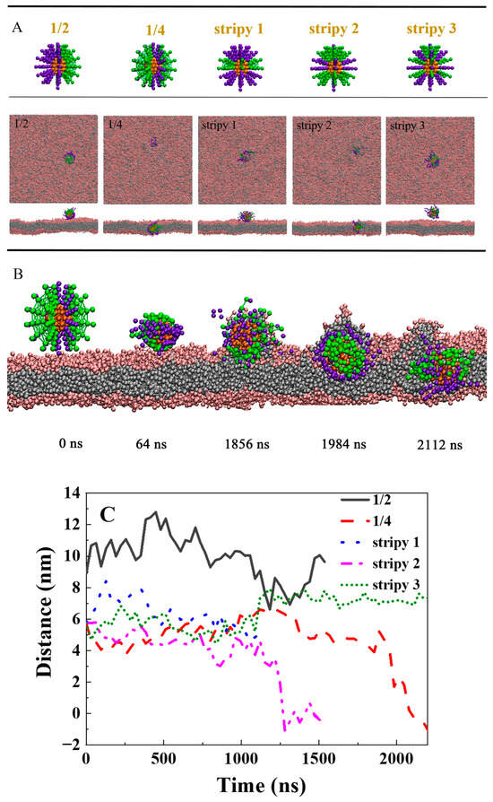To examine the impact of hydrophilic and hydrophobic polymer distributions on their delivery capabilities, three types of polymer distributions were designed for the cargo (Figure 5A): (1) Janus/one-half distribution, where half of the polymers were hydrophilic, and the other half were hydrophobic; (2) one-fourth distribution; and (3) stripy distribution, where polymers alternated between hydrophilic and hydrophobic on the cargo surface, denoted as stripy 1, stripy 2, and stripy 3. The typical snapshots taken after sufficient simulation time are presented in Figure 5A. The one-half distribution polymers were unable to deliver the cargo into the lipid membrane. However, for the same number of hydrophilic and hydrophobic polymers arranged in a one-fourth distribution on the cargo surface, they were able to penetrate the lipid membrane spontaneously (Figure 5A). The details of the penetration process are illustrated in Figure 5B. First, the hydrophilic polymer on the surface of the cargo adheres to the lipid head, and then the hydrophobic polymer interacts with the hydrophobic regions of the cell membrane, driving the cargo into the cell membrane. During the penetration process, the hydrophilic polymer tends to curl up and hide (Figure 5B, 1984 ns). With the self-rotation, the polymers deliver the cargo, inserting deeply into the lipid membrane. Finally, to minimize the hydrophilic–hydrophobic mismatch, the hydrophobic polymer on the surface of the cargo is buried in the hydrophobic core of the membrane, while the hydrophilic polymer tends to extend to the position of the lipid head (Figure 5B, 2112 ns). For the stripy distribution condition, only polymers grafted on the cargo with the stripy 2 model can efficiently assist cargo penetration into the lipid membrane. This is because, compared with other stripy models, the stripy 2 model has more hydrophobic polymers, which provide a greater driving force. Our previous study has shown that stripy NPs with narrow stripes can gradually penetrate the cell membrane with less constrained rotation []. However, when polymer ligands are attached to the surface of the cargo, the system becomes more complex. On the one hand, polymers can adapt to the environment by themselves deforming, which can reduce the driving force to penetrate the lipid membrane, expecially for the hydrophilic and hydrophobic polymers are arranged on the cargo with narrow stripes. On the other hand, the rotation of the cargo becomes more difficult with the polymer modification on the cargo, which also can influence the penentration ability of the compound.