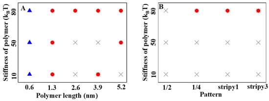 Phase diagrams summarizing the effect of polymer stiffness, polymer length, and polymer pattern on the internalization of hydrophilic cargo: (A) the effect of polymer stiffness and polymer length; (B) the effect of polymer stiffness and polymer pattern; ▲ represents the adhesion; ● represents the penetration; × represents the suspension.
