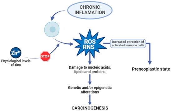Oxidative stress is characterized by an imbalance between the generation of free radicals and reactive metabolites, commonly known as oxidants or reactive oxygen species (ROS), and their removal through protective mechanisms termed antioxidants. Reactive oxygen species are natural by-products of cellular metabolism, serving essential roles in activating signaling pathways within animal cells in response to alterations in intra- and extracellular environmental conditions []. In cells experiencing chronic inflammation, the substantial release of ROS and reactive nitrogen species (RNS) attracts an increased number of activated immune cells, thereby amplifying dysregulated processes, and culminating in a preneoplastic state. If the production of cellular ROS/RNS surpasses the endogenous antioxidant response, irreversible oxidative damage to nucleic acids, lipids, and proteins may occur, inducing genetic and/or epigenetic alterations that disrupt the regulation of oncogenes and tumour suppressor genes. The processes of oxidative stress and chronic inflammation are intricately linked, and the inability to inhibit these processes may result in genetic/epigenetic changes that initiate carcinogenesis (Figure 1) []. This illustrates how important it is to maintain the correct level of zinc in the body. Physiological levels of zinc demonstrate an inhibitory effect on the generation of reactive oxygen species, encompassing superoxide anion (·O−), hydrogen peroxide (H2O2), and hydroxyl radical (OH·), as well as reactive nitrogen species, including peroxynitrite. The direct antioxidant function of zinc ions is associated with their interaction with thiol groups, thereby shielding them from oxidative processes. Zn serves as a cofactor for the antioxidant enzyme Cu, Zn-superoxide dismutase (SOD1), and its activity is attenuated in conditions of zinc deficiency. Furthermore, studies indicate that zinc may indirectly modulate the functionality of other antioxidant enzymes [].