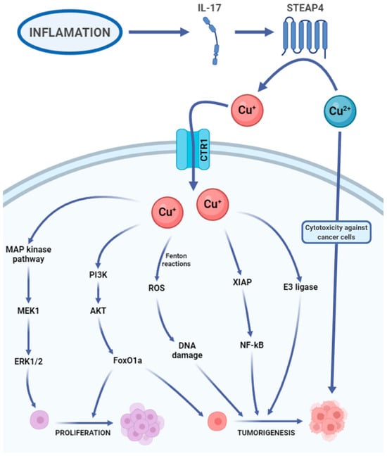 Copper’s carcinogenic potential. IL-17, interleukin 17. Cu+, Cu2+, copper ions. CTR1, high-affinity copper uptake protein 1 (copper transporter 1). MAP kinase pathway, mitogen-activated protein kinase pathway. MEK1, mitogen-activated proteinkinase kinase 1. ERK1/2, extracellular signal-regulated kinases 1 and 2. PI3K, phosphoinositide 3-kinase. ATK, agammaglobulinemia tyrosine kinase. FoxO1a, forehead box O1a. ROS, reactive oxygen species. XIAP, X-linked inhibitor of apoptosis. NF-kB, nuclear factor kappa-light-chain-enhancer of activated B cells. E3 ligase, E3 ubiquitin ligase [,,,,,,,,,,].