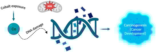 The relationship between cobalt and carcinogenesis. The cobalt atom can interact with DNA, and processes such as oxidative stress and DNA damage are the main mechanisms by which cobalt can induce carcinogenesis. Exposure to cobalt leads to changes in DNA which can result in the development of cancer [,].
