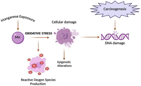 Link between manganese and carcinogenesis. The figure shows how exposure to manganese can lead to DNA damage, which in turn can trigger carcinogenic processes, leading to the development of cancer [,].