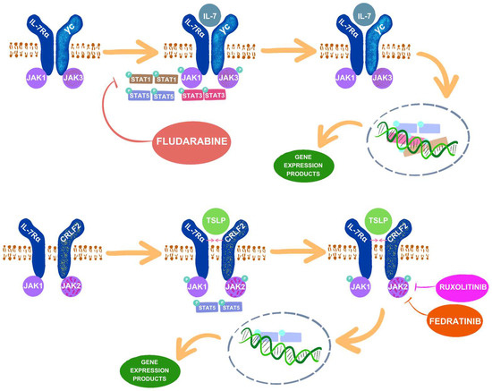 Figure 2. Effects of IL-7 and TLSP on the JAK–STAT signaling pathway and the action of selected inhibitors of pathway components: IL-7 leads to the activation of Janus kinases JAK1 and JAK3, as well as STAT1, STAT3, and STAT5, which are translocated to the cell nucleus, regulating gene expression. TSLP, through heterodimerization of IL-7α with CRLF2, activates JAK1 and JAK2, as well as the effector STAT5, which translocate to the cell nucleus and influences gene expression. Fludarabine is an inhibitor of STAT1, while ruxolitinib and fedratinib are JAK2 inhibitors. By preventing the activation of their target molecules, these drugs exert inhibitory effects on the JAK–STAT pathway.