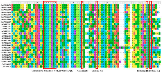 - Maeo, K.; Hayashi, S.; Kojima-Suzuki, H.; Morikami, A.; Nakamura, K. Role of conserved residues of the WRKY domain in the DNA-binding of tobacco WRKY family proteins. Biosci. Biotechnol. Biochem. 2001, 65, 2428–2436. [Google Scholar] [CrossRef] [PubMed]