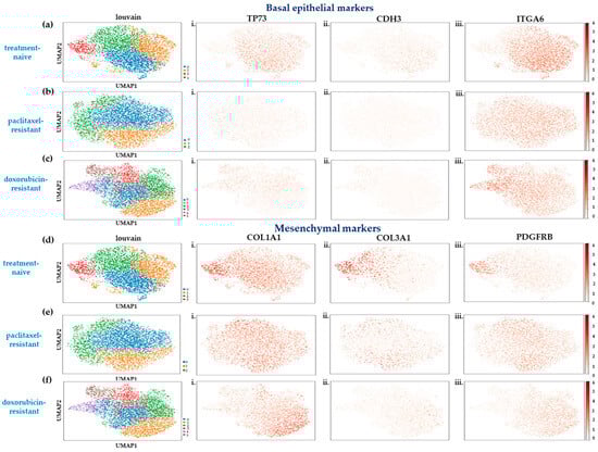 In the upper panel, UMAP plots of the SUM-159 (a) treatment-naïve, (b) paclitaxel-resistant, and (c) doxorubicin-resistant cells grown in monolayer are shown, as well as the individual single-cell expression patterns of the basal epithelial marker genes (i) TP73, (ii) CDH3, and (iii) ITGA6 in these cell states. In the lower panel, (d–f) the same UMAP plots (d–f) are shown along with the individual single-cell expression patters of the mesenchymal marker genes (i) COL1A1, (ii) COL3A1, and (iii) PDGFRB.