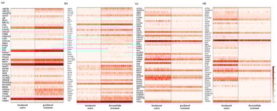 In the 2D-grown cells, a pseudobulk analysis of counts of the scRNA-seq data revealed 42 and 55 upregulated genes in the paclitaxel- (Figure 2a) and doxorubicin- (Figure 2b) resistant cells, respectively. We compared these results with our previously published bulk RNA-seq data for the paclitaxel-resistant cells [8], while we performed new transcriptomic experiments for the doxorubicin-resistant ones. We identified 20 common genes in the first case (Figure S1a) and 25 in the latter (Figure S1b). As expected, most of these genes were expressed both in higher levels and in a higher fraction of the population in the chemoresistant cells compared to the treatment-naïve ones (Figures S1a,b). Regarding downregulated genes, the analysis of the scRNA-seq data identified 52 and 50 such genes in the paclitaxel- (Figure 2c) and doxorubicin- (Figure 2d) resistant cells, respectively. Comparison with the corresponding bulk RNA-seq data revealed 18 and 15 common genes, respectively, as shown in Figures S1c,d.