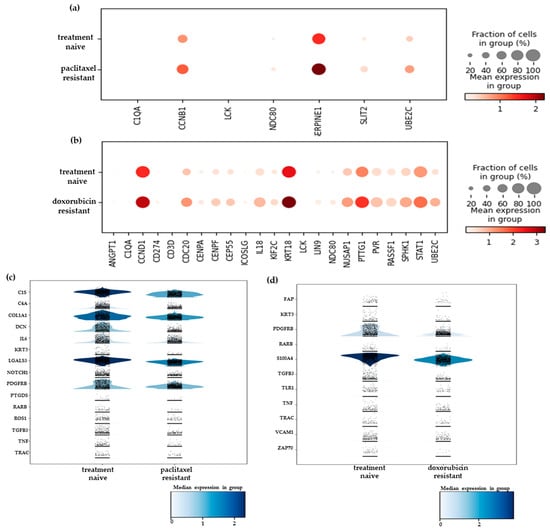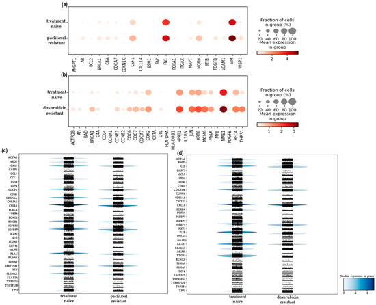 Differentially expressed genes in the 2D-cultured chemoresistant SUM159 cells compared to the treatment-naïve ones that were identified only by single-cell (sc) RNA- and not by bulk RNA-sequencing. Dotplots depicting genes that are upregulated in the (a) paclitaxel- and (b) doxorubicin-resistant cells, respectively. Stacked violin plots depicting genes that are downregulated in the (c) paclitaxel- and (d) doxorubicin- resistant cells, respectively. Each dot represents the normalized gene expression per cell. The PTPRC gene is missing from (a) and the CD244 and TCL1A genes are missing from (b) due to their very low counts in the treatment-naïve cells that excludes them from the filtered count matrix.