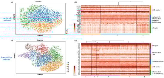UMAP plots depicting clusters (subpopulations) of SUM159 (a) paclitaxel- and (c) doxorubicin-resistant cells grown in monolayer. The expression levels of the top 10 differentially expressed marker genes in each identified cluster are shown in heatmaps for the paclitaxel- (b) and the doxorubicin-resistant (d) cell states. Representative biological processes possibly mediating chemoresistance in each cell cluster are shown.