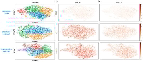 The expression patterns of the 2 ABC transporters ABCB1 (a) and ABCG2 (b) are shown in single cells of the different clusters of SUM159 treatment-naïve (upper panel), paclitaxel- (middle panel) and doxorubicin- (lower panel) resistant cells.