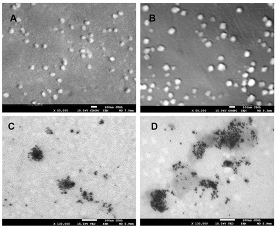 Electron microscopy (SEM) images of Hyal/Ag (A) and Hyal/Ag/GO (B) at ×50,000 magnification, along with transmission electron microscopy (TEM) detector images of Hyal/Ag (C) and Hyal/Ag/GO (D) at ×130,000 magnification.