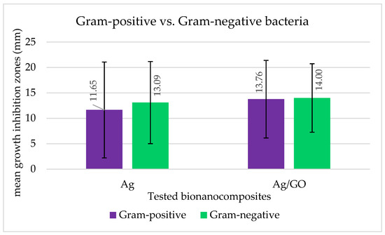 Statistical analysis of the results showed that the differences in the growth inhibition between the Hyal/Ag and Hyal/Ag/GO, as well as between Gram-positive and Gram-negative bacteria, were statistically not significant (p < 0.05). This is probably due to the very distinct differences in the effectiveness of the bionanocomposites against individual groups of bacteria (which were, on the other hand, statistically significant, p < 0.05; Supplementary Table S2).