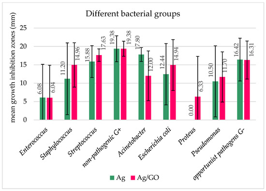 The effectiveness of the bacteriostatic effect of the bionanocomposites against bacteria was also interpreted in terms of the size of the growth inhibition zones on and around the applied Hyal/Ag and Hyal/Ag/GO foils (Figure 2, Figure 3 and Figure 4). Figure 2 shows the differences between the bacteriostatic activity of the applied bionanocomposite foils against Gram-positive and Gram-negative bacteria. As can be seen, Hyal/Ag/GO proved more effective against both groups than Hyal/Ag, and the growth inhibition of Gram-negative bacteria was higher than Gram-positives (mean growth inhibition zones of 13.1 and 14.0 mm caused by Ag and Ag/GO for Gram-negatives while 11.6 and 13.8 mm for Gram-positives). As can be seen in Figure 3, the smallest growth inhibition was observed for Gram-positive Enterococcus (6.08 and 6.04 mm for Hyal/Ag and Hyal/Ag/GO, respectively) and Gram-negative Proteus (0, i.e., no inhibition and 6.33 for Hyal/Ag and Hyal/Ag/GO, respectively). On the other hand, the highest mean growth inhibition zones were caused by Hyal/Ag against non-pathogenic Gram-positive isolates and Gram-negative Acinetobacter (19.38 and 17.80 mm, respectively). Hyal/Ag/GO was the most effective against non-pathogenic Gram-positives, Gram-positive Streptococcus, and opportunist Gram-negative pathogens (19.38, 17.63, and 16.31 mm, respectively). Among the examined groups of bacteria, Gram-negative Proteus and Gram-positive Enterococcus and S. aureus, as well as non-pathogenic Gram-positive bacteria, differ significantly (p < 0.05) in their reaction relating to the examined bionanocomposites (Supplementary Table S1). The varying reactions of the bacterial strains to the applied bionanocomposite foils are also documented in Figure 4.