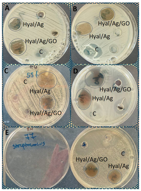 Bacteriostatic activity of the bionanocomposites (Hyal/Ag and Hyal/Ag/GO) compared to the control (C) against the following: (A) Escherichia coli, (B) Serratia marcescens, (C) Staphylococcus lentus, (D) Sporosarcina luteola, and (E) Streptococcus canis. The growth inhibition zones are marked with grey circles.
