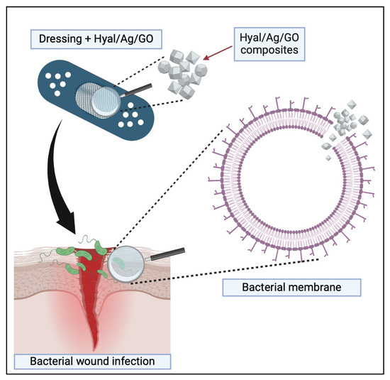 A scheme presenting the potential application of the Hyal/Ag/GO composite examined in this study. Wounds are frequently infected with bacteria that increasingly become antibiotic-resistant. Applying bioactive topical dressings that contain, e.g., the Hyal/Ag/GO composite, the bactericidal effectiveness has been confirmed in this study, allowing the prevention of such infections. This results from the fact that graphene oxide damages bacterial cells, allowing the Ag nanoparticles to act more effectively than without combination with GO.