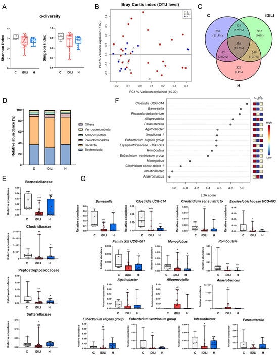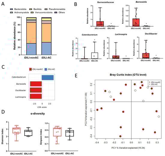2.2. Analysis of Fecal Gut Microbiota Composition Shows a Specific Profile Associated with Idiosyncratic Drug-Induced Liver Injury
