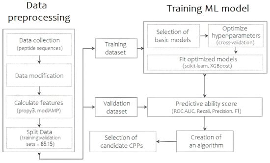 To speed up and optimize the process, most research to date has focused on using machine learning methods to predict CPPs based on their descriptors, as they can be involved in the de novo design process of CPPs [,,,,]. This makes it possible to analyze large amounts of data and identify patterns in the structure and activity of molecules, speeding up the process of selecting potentially active compounds.