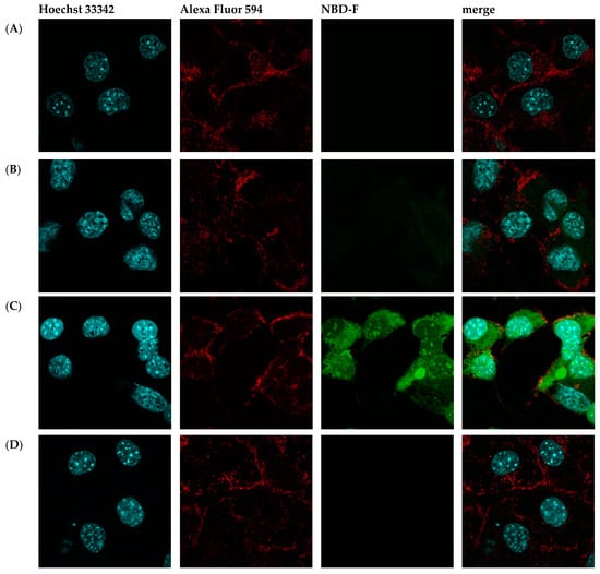 McCoy cells (2 × 105 cells/mL) were cultured overnight on glass confocal dishes (SPL Life Sciences Co., Ltd., Pochon, Kyonggi-do, Republic of Korea). After washing with Hanks’ balanced salt solution (HBSS), cells were incubated with 20 mM NBD-F-labeled peptides or peptide-free Opti-MEM (Gibco) for 4 h at 37 °C. Penetratin (RQIKIWFQNRRMKWKK) was used as a positive control. Nuclei were stained with Hoechst 33342 (Invitrogen, Eugene, OR, USA). Cell membranes were stained with Alexa Fluor 594 (Invitrogen, Eugene, OR, USA). After washing for fixation, cells were treated with 4% formaldehyde for 20 min. Fluorescent peptide localization was examined by a Nikon Ti2-E Inverted Microscope (Nikon Instruments Inc., Tokyo, Japan). Images were processed using the Fiji software (version 2.9.9/1.53t) [].