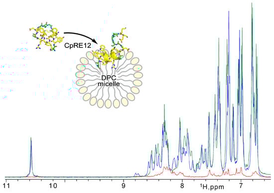 Since the CpRE12 peptide does not have cysteine bridges, it is supposed to be flexible and unstructured in an aqueous solution. Indeed, the 1H-NMR spectrum (Figure 3) revealed a strong signal broadening and a small signal dispersion, suggesting a lack of distinct spatial structure and some oligomerization of CpRE12 in water. However, after adding a suspension of DPC micelles to the dissolved peptide sample (Figure 3), the dispersion and intensity of the 1H signals increased dramatically, which implies CpRE12 folded into a conformation favoring interaction with the DPC micelle.